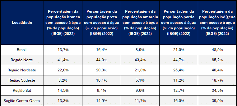 Além disso, de acordo com dados do IBGE (2022), disponíveis no Painel Saneamento Brasil, a população indígena é a mais afetada pela falta de água, com quase metade (48,9%) sem acesso ao recurso hídrico. Em seguida, as populações parda e preta também estão entre as mais prejudicadas pela ausência de água.