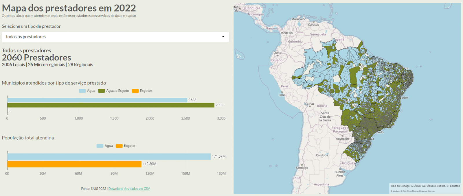 Pela ferramenta é possível visualizar a atuação das seguintes categorias de prestadores em todo o território nacional. Os dados utilizados são do SNIS (Sistema Nacional de Informações sobre Saneamento) para o ano de 2022. As categorias são:
