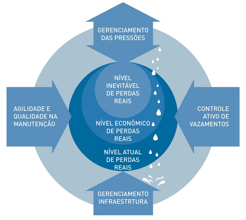 Analisando a figura, percebesse que a atuação na redução das perdas reais de água depende de basicamente quatro abordagens: pressão média do sistema; gestão dos ativos da infraestrutura; controle ativo de vazamentos e rapidez e qualidade dos reparos.
