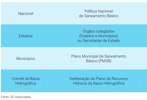 O governo federal assumiu a responsabilidade pelo planejamento nacional, assim como pelo fornecimento de diretrizes gerais para o setor, as quais também servem de orientação para o financiamento das atividades de saneamento pelos bancos federais. Como Caixa Econômica Federal (CEF), Banco Nacional de Desenvolvimento Econômico e Social (BNDES) e Banco do Nordeste (BNB). Estados e municípios receberam a atribuição de planejar a infraestrutura básica em nível local ou regional.