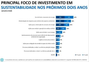 E, para incrementar as ações sustentáveis, nos próximos dois anos, o principal foco de investimento dos empresários industriais é o uso de fontes renováveis de energia, citado por 42% dos entrevistados, seguido por modernização de máquinas (36%) e medidas para otimizar o consumo de energia, indicado como prioridade para 32% dos industriais.