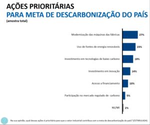 Apesar das medidas que vêm sendo adotadas pela indústria, ainda há muito a ser feito para que o Brasil avance em relação à redução das emissões de gases de efeito estufa e atinja as metas estabelecidas no Acordo de Paris. Quando perguntados sobre as ações prioritárias para que a indústria contribua com a descarbonização do país, os empresários elencaram a modernização de máquinas (27%), o uso de fontes de energias renováveis (23%) e investimento em tecnologias de baixo carbono (19%). Outras medidas citadas foram investimento em inovação (14%) e acesso a financiamento (10%).