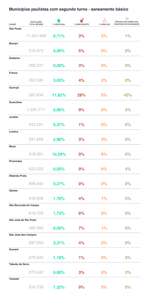 O estado de São Paulo concentra 18 das 52 cidades brasileiras que foram ao segundo turno. Com exceção de São José do Rio Preto, todas estão localizadas em Regiões Metropolitanas ou Aglomerações Urbanas, arranjos que a princípio podem compartilhar estruturas e estratégias para questões de Saneamento e Segurança Hídrica.