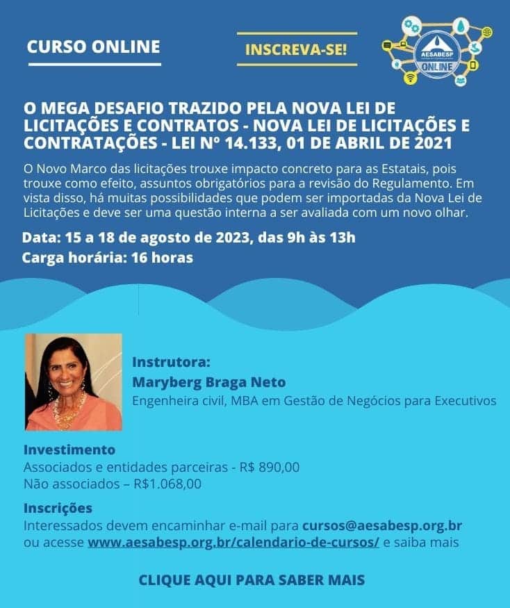 A AESabesp promoverá o Curso Online – O mega desafio trazido pela nova Lei de Licitações e Contratos – Nova Lei de Licitações e Contratações – Lei Nº 14.133, 01 de abril de 2021, que será ministrado pela instrutora Maryberg Braga neto. O curso acontecerá de 15 a 18 de agosto, das 9h às 13h, em plataforma online.